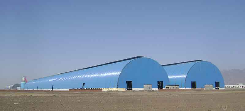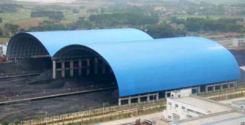 本工程為筒殼網架結構,建筑面積17.36萬平方米,展開面積28.36萬平方米;網架坐落在2米高的混凝土擋風墻上,按使用功能設置了防火、防塵、防爆、采光等設施。