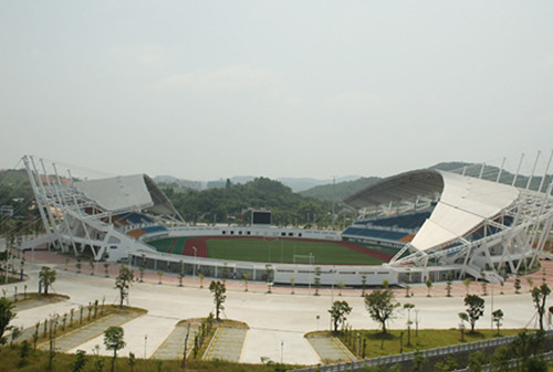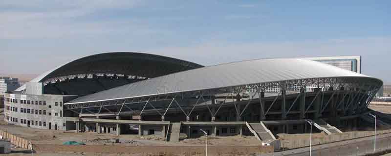 本工程分為體育館和體育場,體育館為網架結構,體育場為管桁架和索膜結構,體育場可容納觀眾2400人。