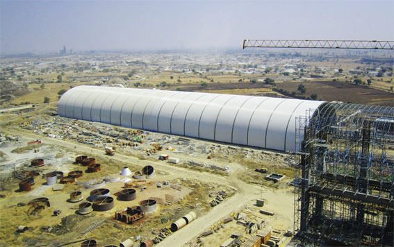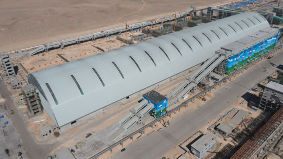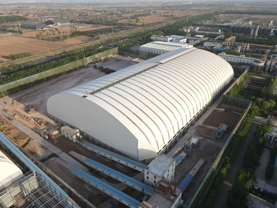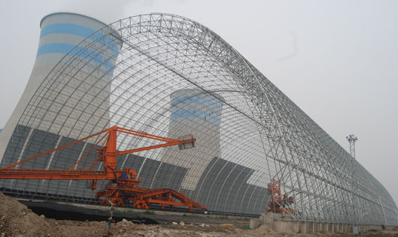 具有桿系和殼體雙重受力的特點,提出了設計和分析時合理的結構形式、利用三心圓滿足儲料倉凈空的要求。利用仿真分析技術設計、控制了含鋼量。安裝:采用塔架支撐、逆安裝、單邊起步等工藝完成起步單元做成穩定結構承受施工荷載的高空散裝施工工藝,保證了柱面網殼在安裝過程中的質量和安全。